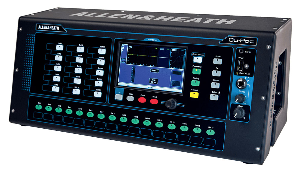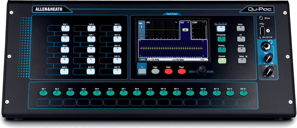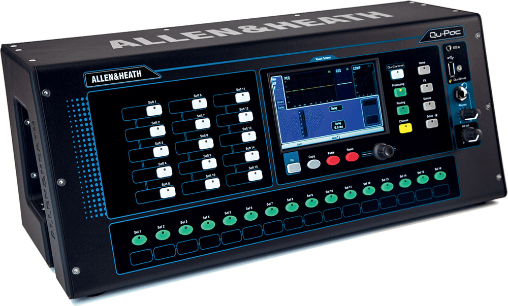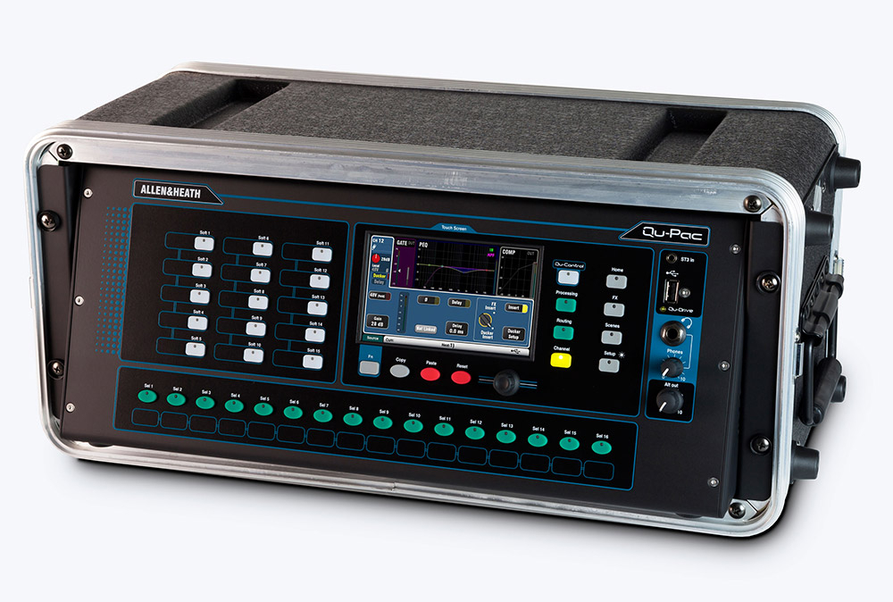 La Qu-PAC de Allen & Heath est une console de mixage numérique, au format desktop avec 16 préamplis analogiques, 5 cœurs de traitement ARM Core, moteur iLive FX, contrôle par écran tactile, enregistreur USB multipiste, port dSnake, streaming audio USB et application de contrôle à distance iPad.