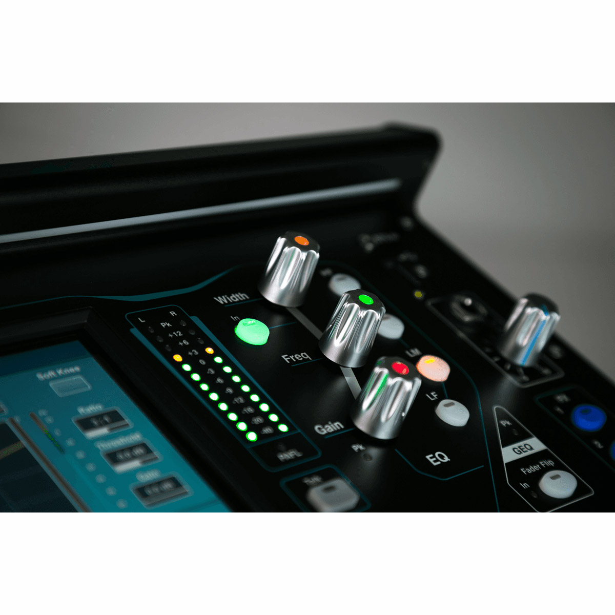 - Contrôles physiques dédiés pour chaque canal d'entrée : Gain, fréquence HPF, Seuil Gate, Seuil Compresseur, Panoramique, Gain/Fréquence/Largeur égalisation.
