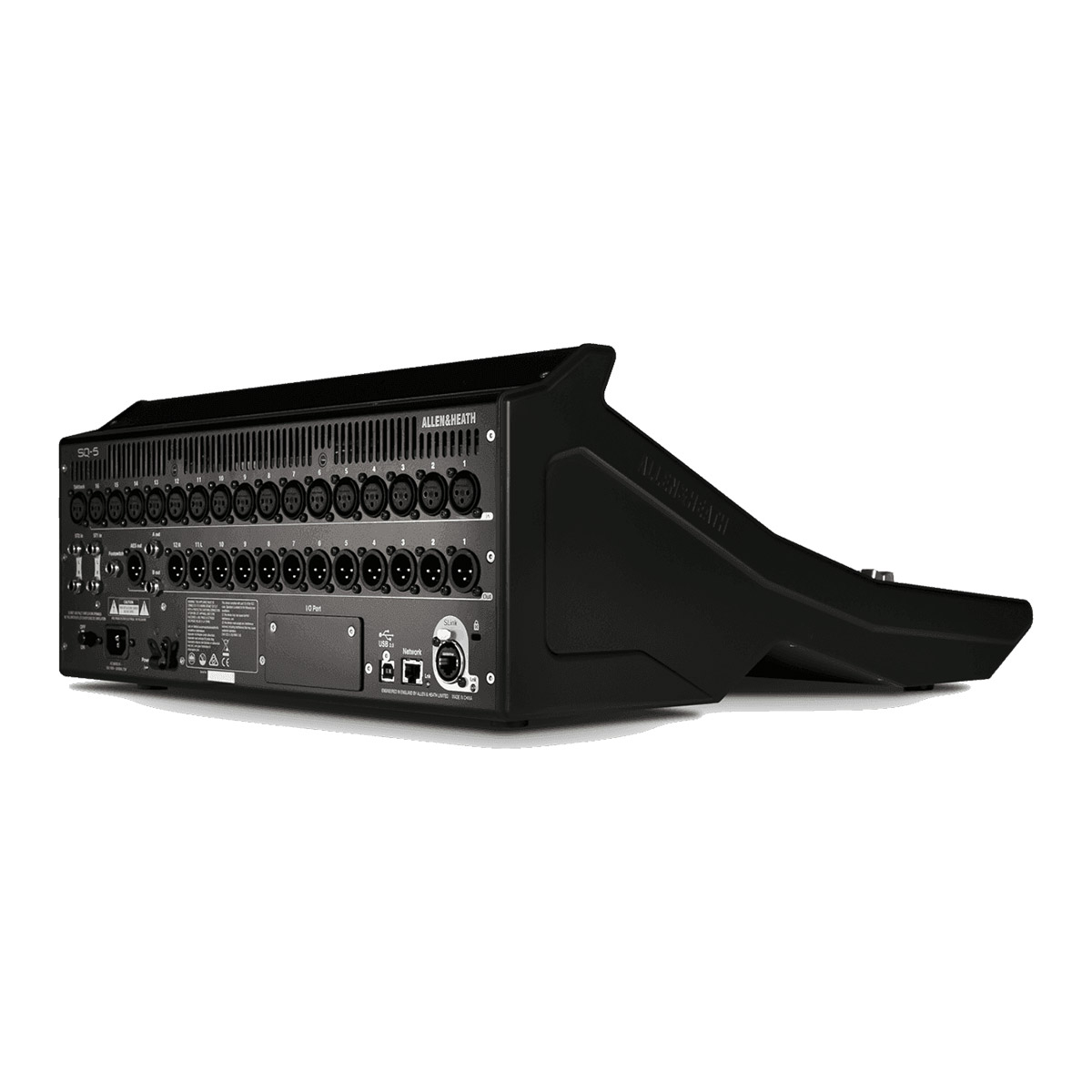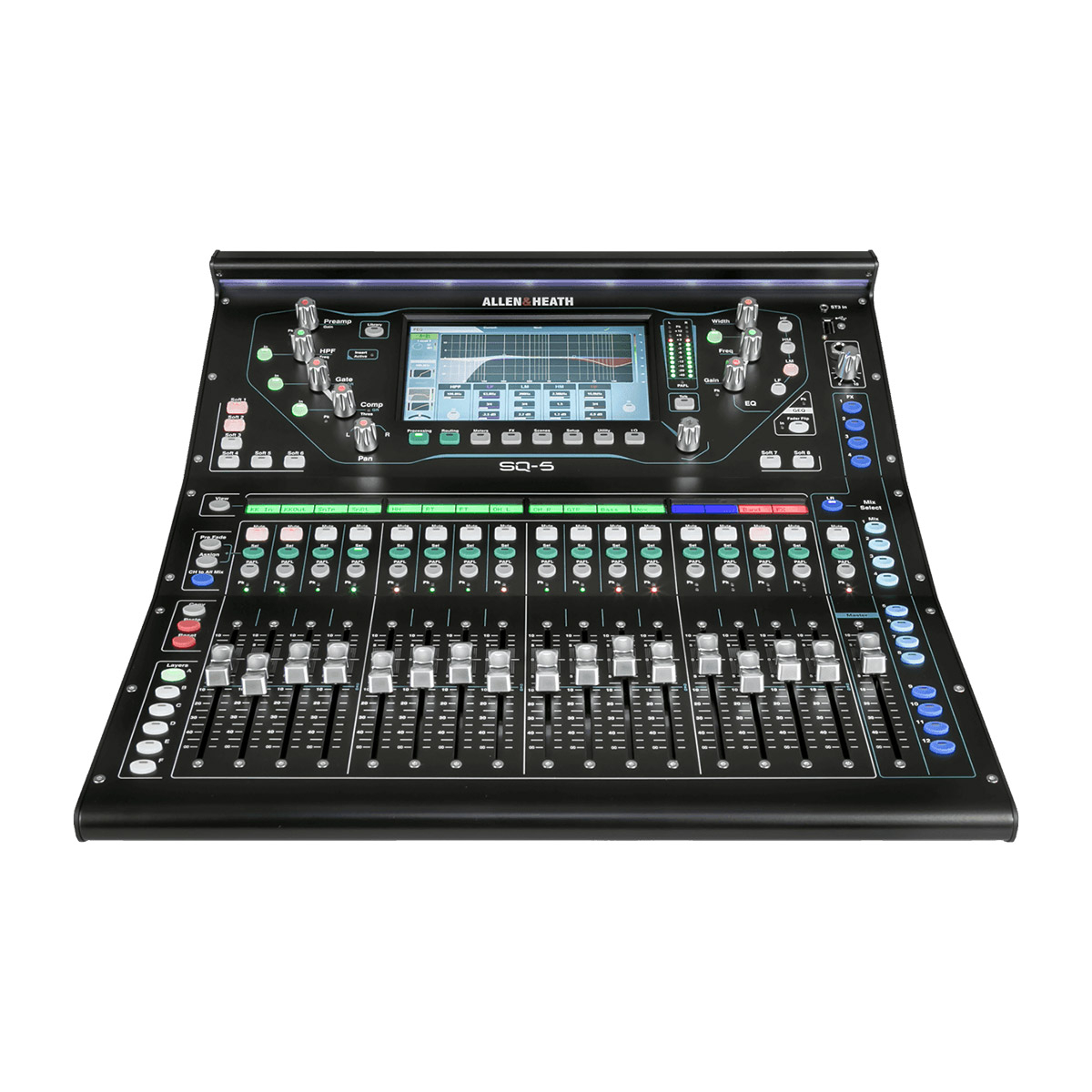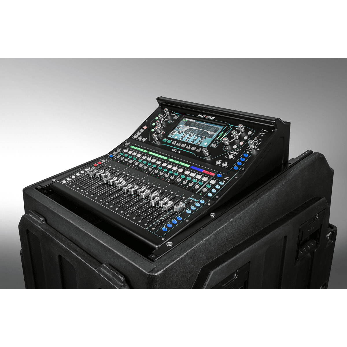 La SQ-5 de Allen & Heath est une console de mixage numérique 48 canaux, avec 17 faders, 6 couches de faders, interfaces USB 32 x 32 et fonctionnement en réseau Audio (Audio Network).