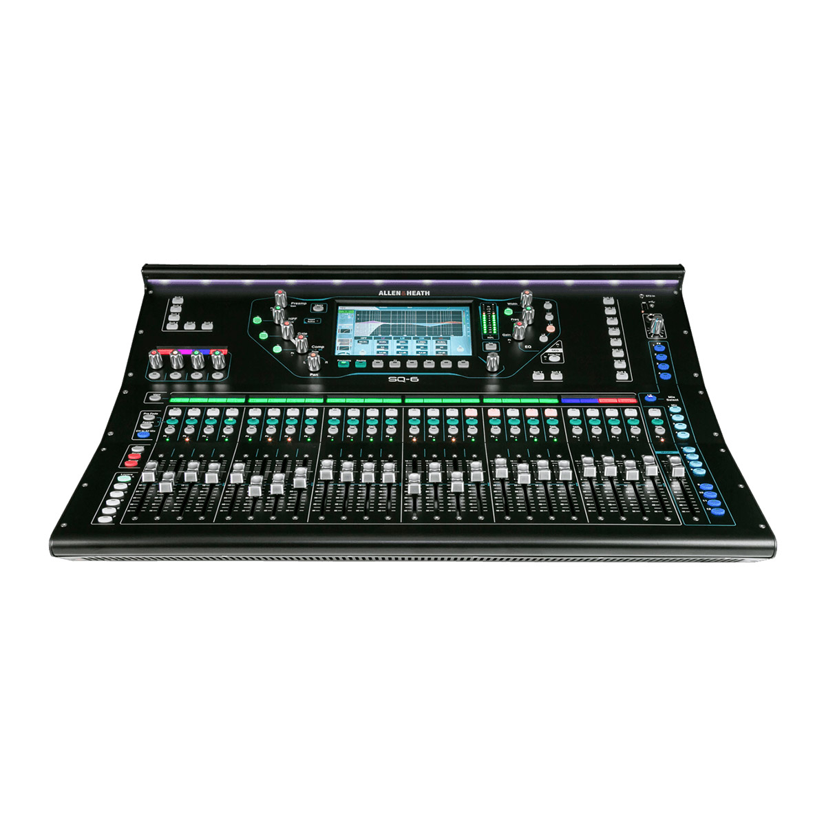 La SQ-6 de Allen & Heath est une console de mixage numérique 48 canaux, avec 25 faders, 6 couches de faders, interfaces USB 32 x 32 et fonctionnement en réseau Audio (Audio Network).
