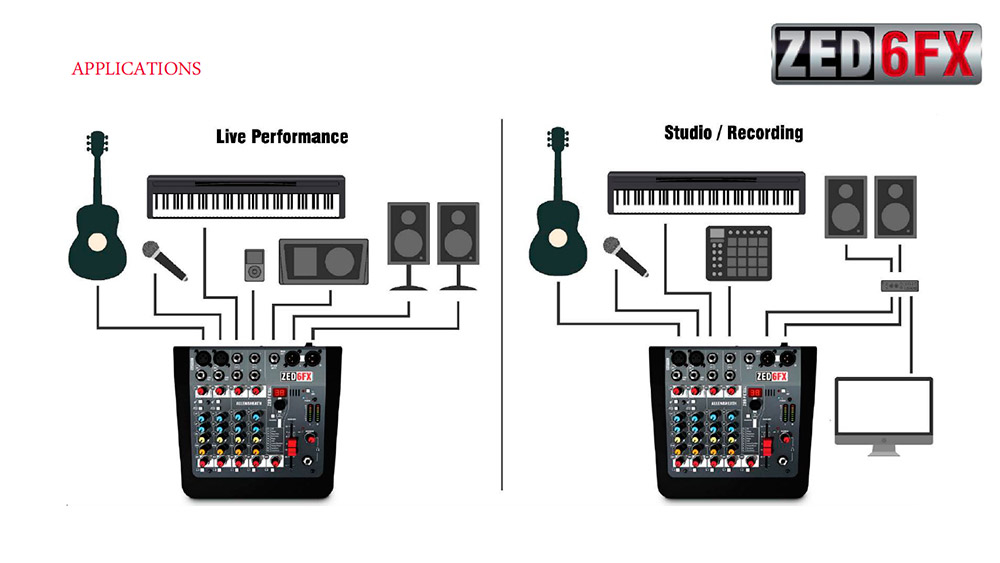 Le ZED-6FX Allen & Heath est équipé de deux préamplis micro GSPre, de qualité. Mais le ZED-6FX va encore plus loin avec la présence d'entrées instruments ou niveau ligne. Ces entrées vous permettent de brancher votre guitare directement sur la carte sans boîtier DI.Avec le ZED-6FX, il est facile de composer les réglages de tonalité de chaque instrument, grâce à l'égaliseur deux bandes intégré. La ZED-6FX possède des effets embarqués, tels que des reverbs, des delays, des chorus, ainsi que d’autres effets de modulation permettant de créer une nouvelle dynamique et de varier les sonorités en s’approchant d’une qualité studio.