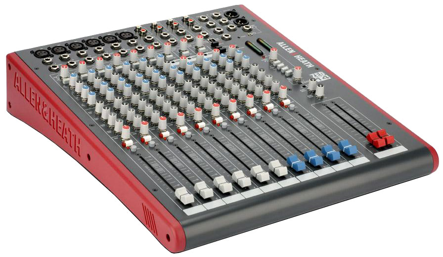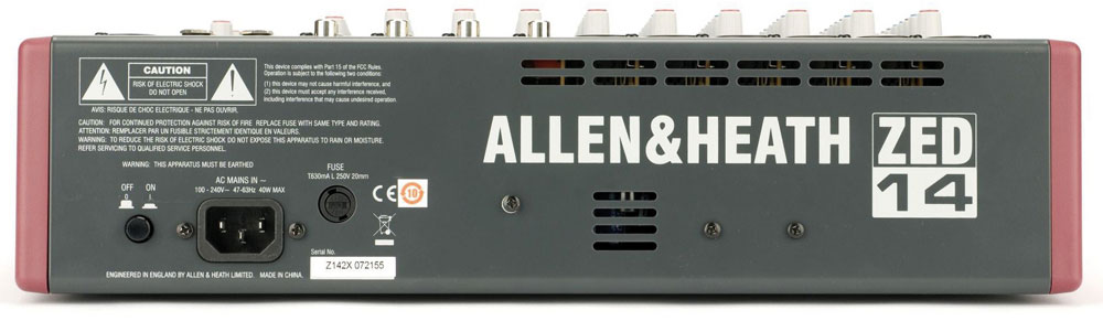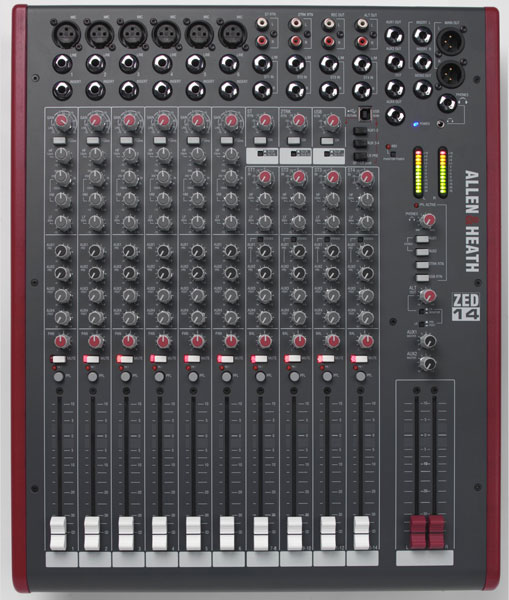 La ZED-14 Allen et Heath est une console Live 12 canaux USB, 6 entrées mono, 4 entrées stéréo, un égaliseur 3 bandes et une connexion USB.