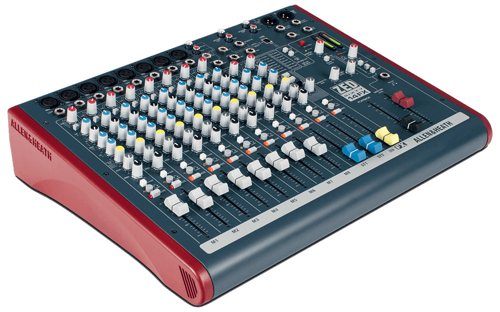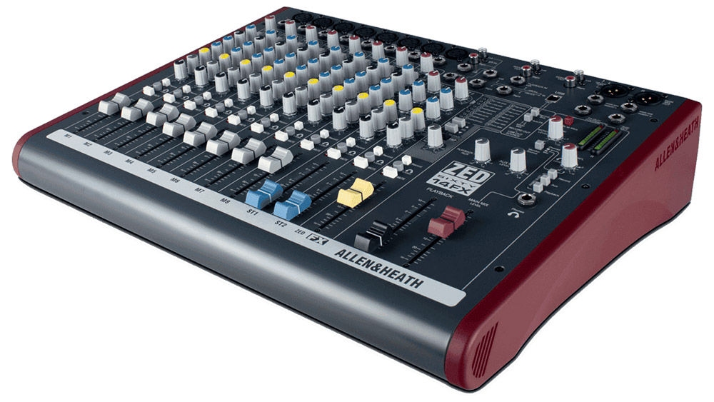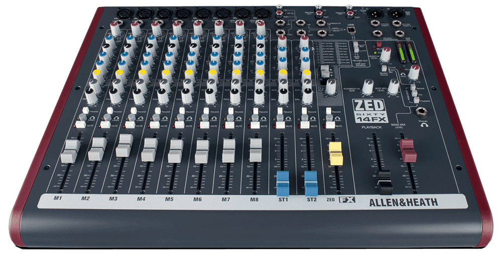 La ZED60-14FX de Allen & Heath est une console de mixage 14 canaux avec 8 canaux micro/ligne, 3 canaux stéréo, 2 DI guitare, 16 effets intégrés et une sortie USB.