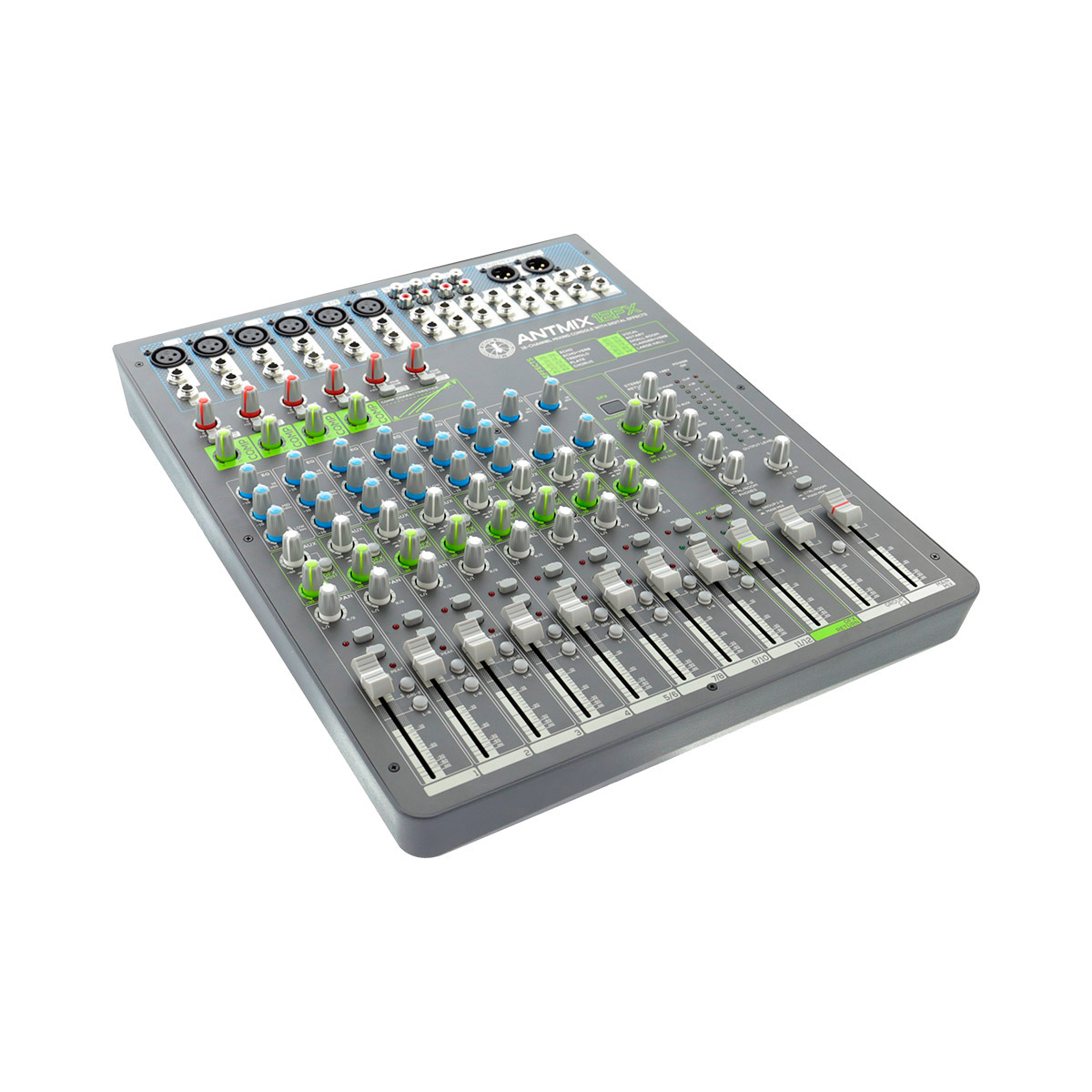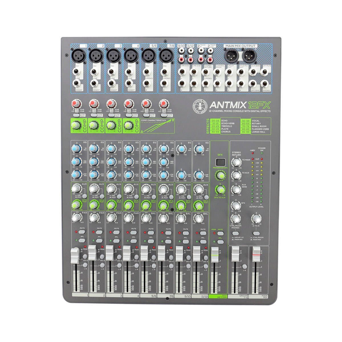 L'ANTMIX 12FX est une console de mixage analogique 12 canaux, avec un DSP intégré proposant des effets ajustables, 4 entrées micro avec compresseurs intégrés, 2 entrées combo micro/ligne, des faders de 60mm et un grand choix de connecteurs.