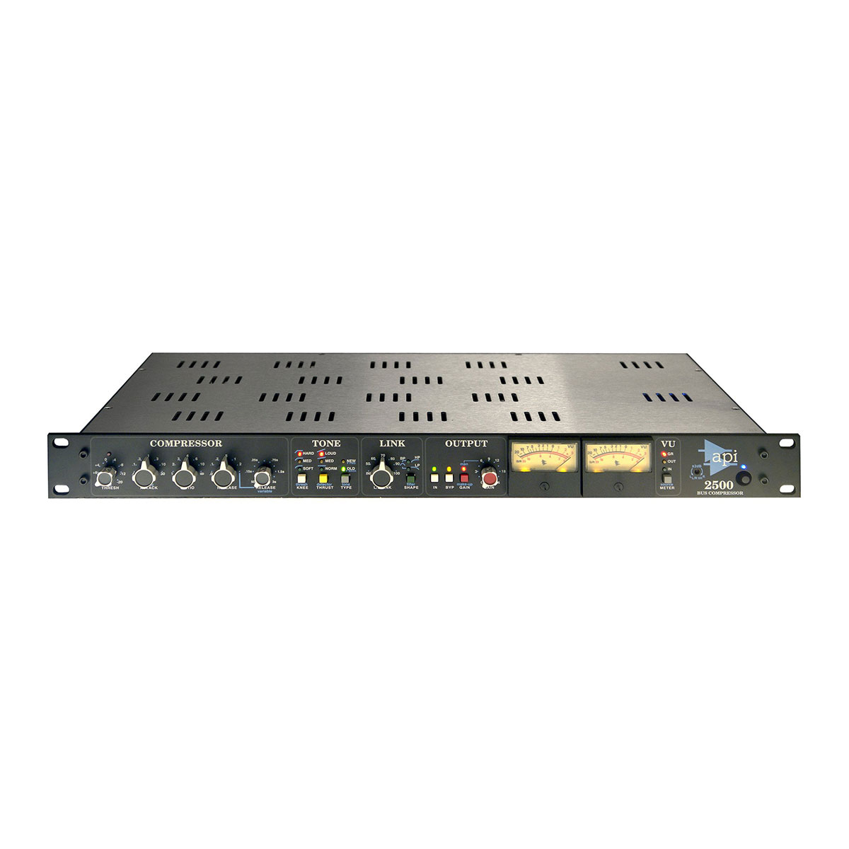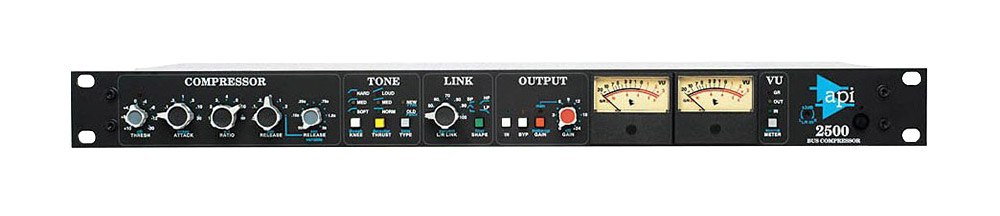 L’API 2500 est un compresseur stéréo polyvalent qui permet un ajustement des qualités sonores pouvant altérer le timbre et le dynamisme d’un mixage stéréo. L’appareil, montable en baie 19’’, propose le circuit déposé « Thrust » pour des basses nerveuses et puissantes. Sa conception en double canal lui donne la possibilité de compresser aussi bien un mélange stéréo que deux sources avec les mêmes réglages. Le 2500 embarque une gamme de paramètres qui le rendent incroyablement musical.