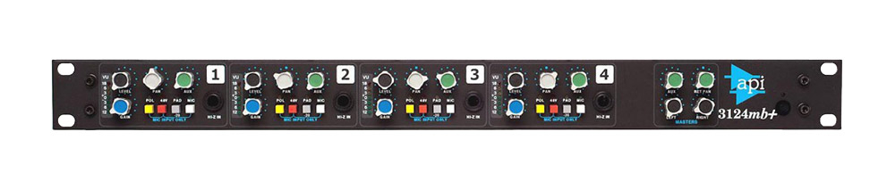 Le modèle 3124MB+ utilise le même circuit de préamplification micro que l’on trouve dans toutes les consoles API. Il embarque le transformateur d’entrée micro RE-115 K et le même transformateur de sortie que tous les égaliseurs API. Les quatre entrées micro du 3124MB+ sont alimentées par une alimentation fantôme 48V interne, sélectionnable pour chaque canal en façade avant. L’atténuateur -20dB, également en façade avant, agit sur les entrées micro et ligne.