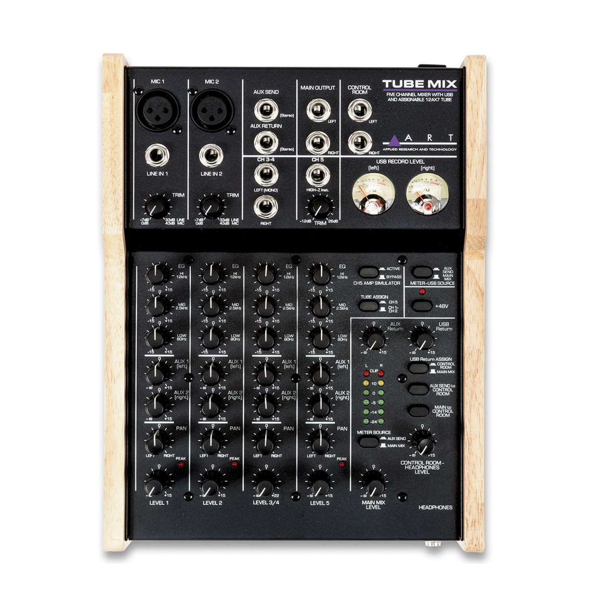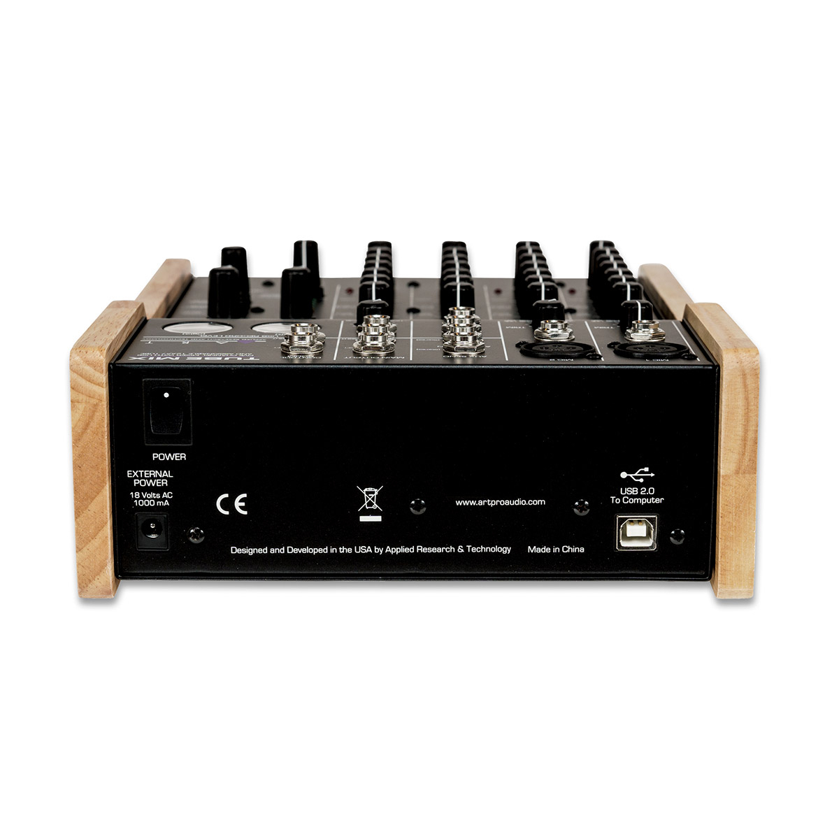 Le TubeMix d'ART est une console de mixage 5 canaux, avec interface audio USB intégrée, préamplification à lampe et simulateur d'ampli.