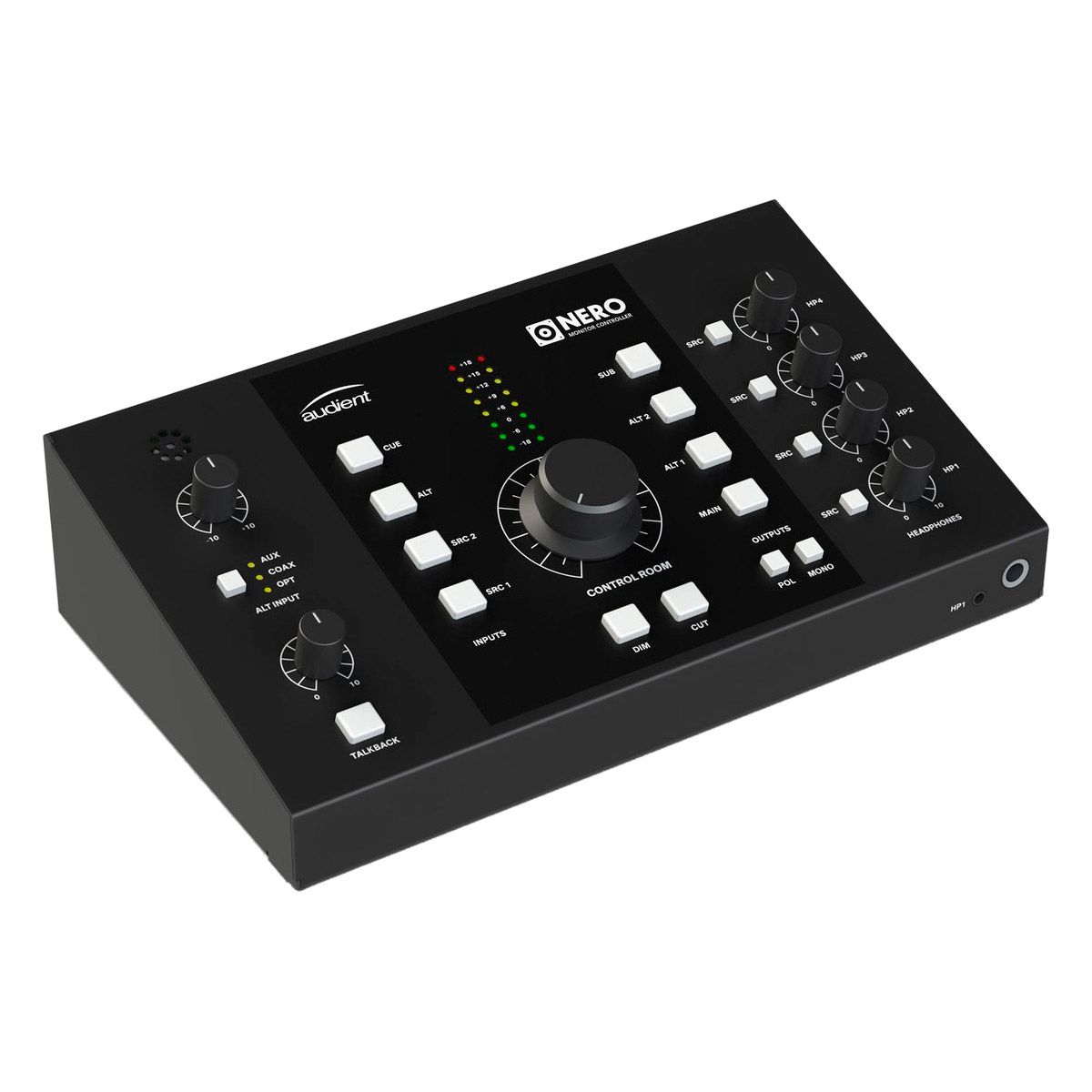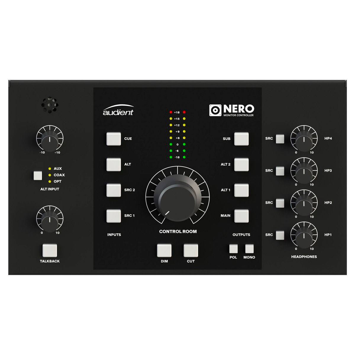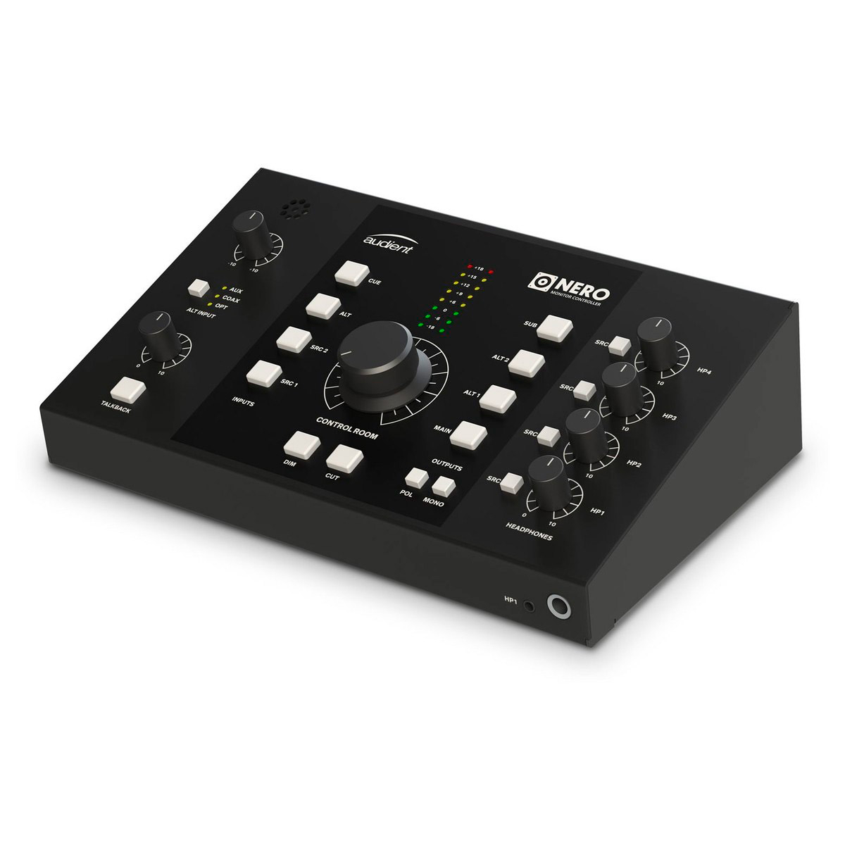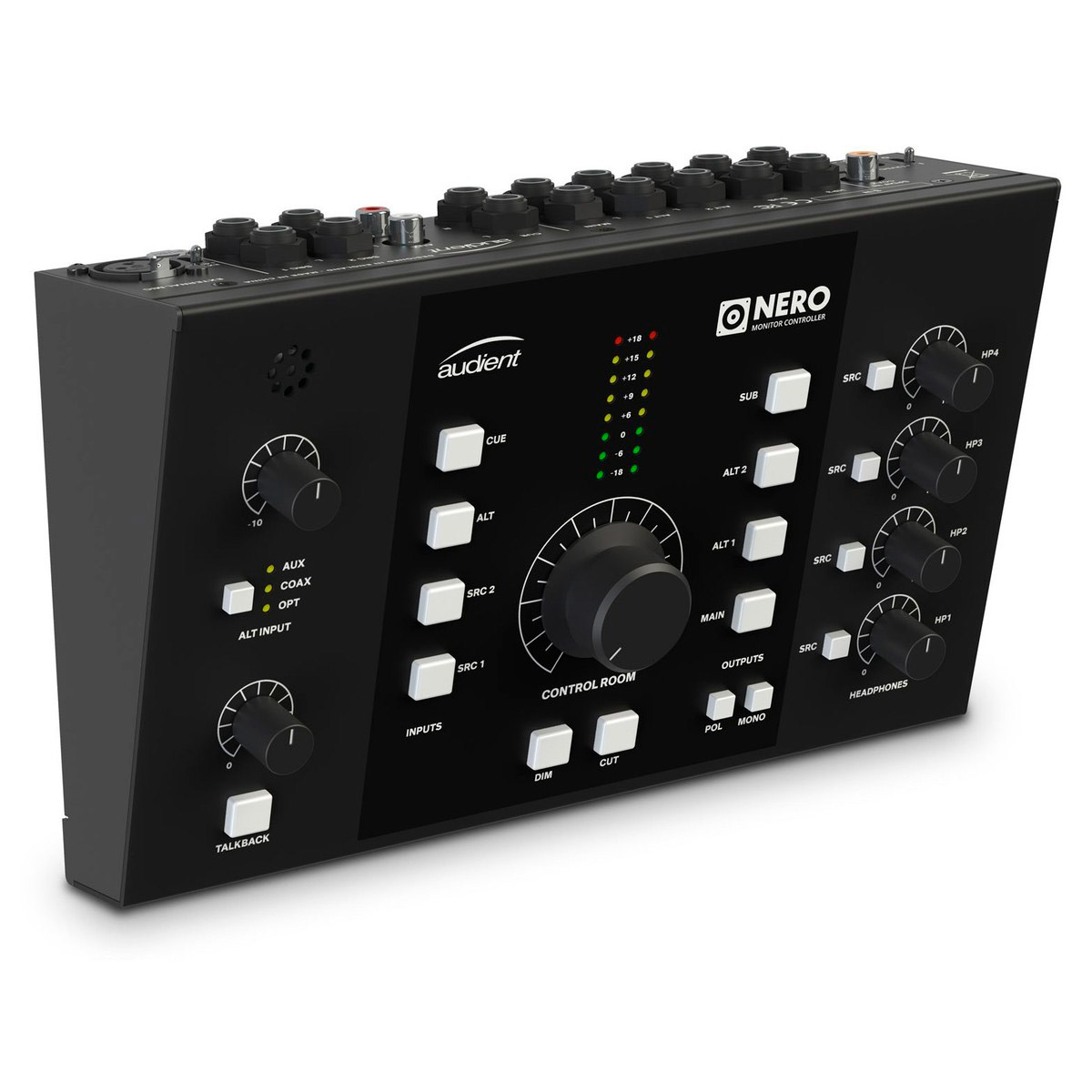 L'Audient Nero est un contrôleur de monitoring compact prévu pour 3 paires d'enceintes. Il est équipé de 2 x entrées stéréo de niveau ligne, 1 x entrée Cue Mix, 2 x entrées auxiliaires, entrées optiques et coaxiales S/PDIF, 3 x sorties haut-parleur stéréo, 1 x sortie auxiliaire ; 4 x sorties casque, mais également un Talkback avec micro interne et commandes Dim, Cut, mono et changement de polarité.