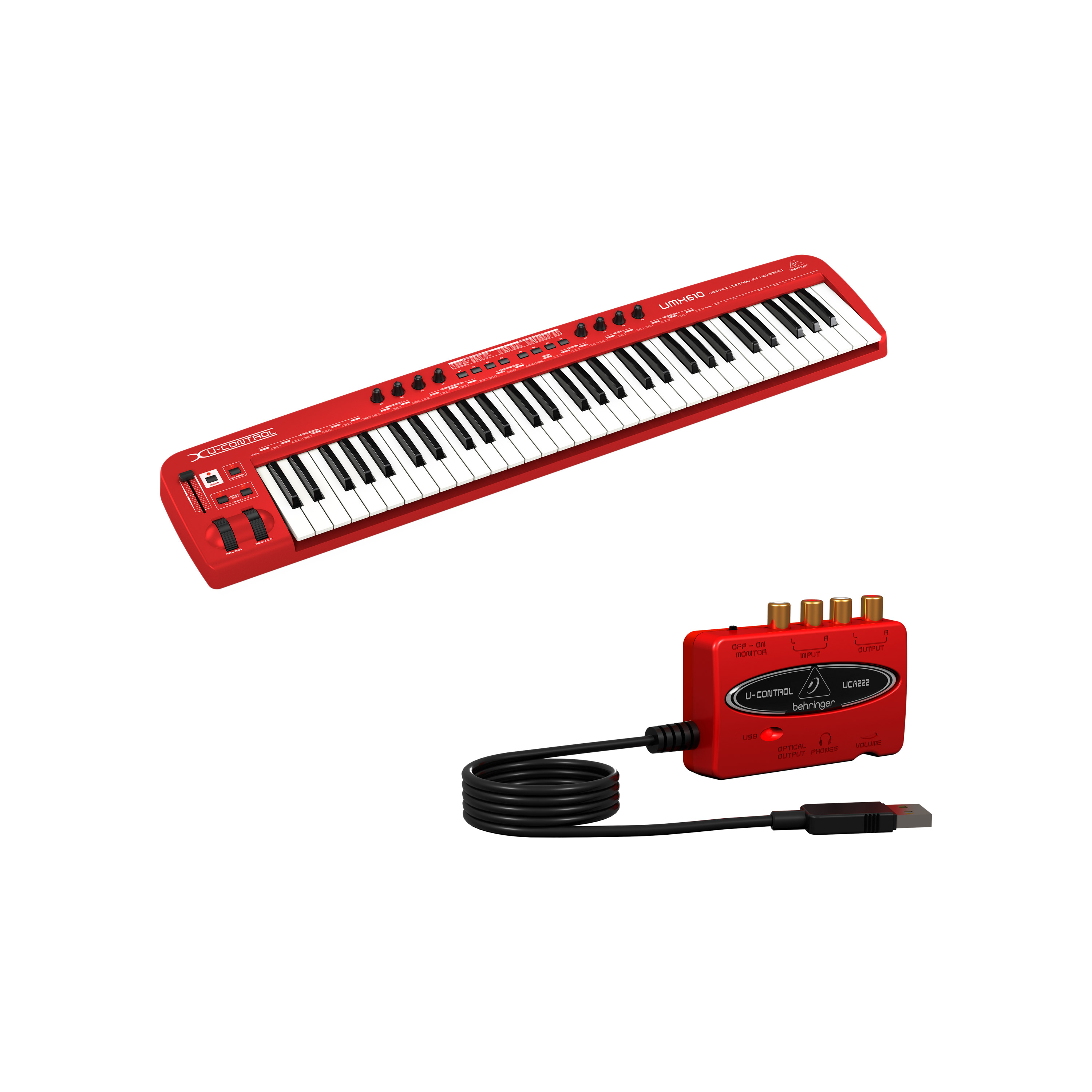 Le contrôleur USB/MIDI Behringer U-Control UMX610 à 61 touches comprend huit contrôleurs temps réel, une molette de pitch, 10 commutateurs assignables et une molette de modulation.