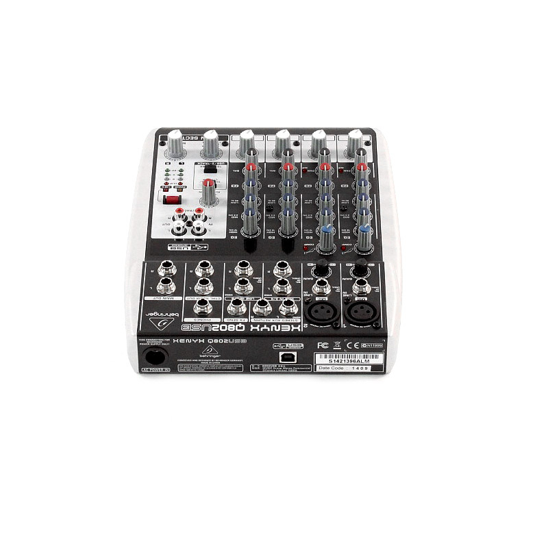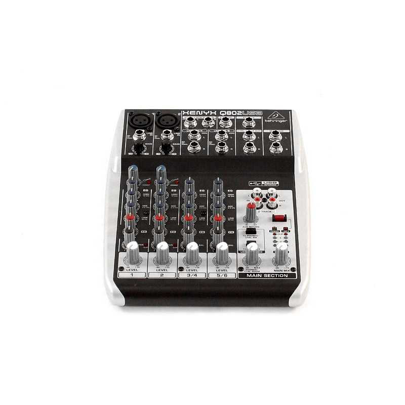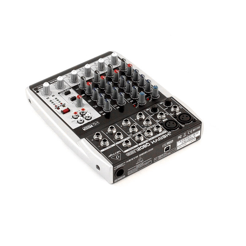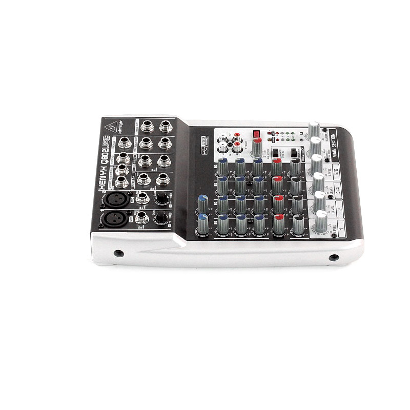 Le Behringer Xenyx Q802USB est un mixeur analogique compact avec 8 entrées (2 micro/ligne, 2 lignes stéréo, retour auxiliaire stéréo), 2 bus avec préamplis micro et compresseurs Xenyx, égaliseur 3 bandes " British " de Behringer et interface audio USB. Les entrées 2 pistes et USB sont affectables au mix principal ou à la sortie casque. Du côté de la sortie, le Behringer Xenyx Q802USB vous donne accès au Control Room, aux casques et aux sorties 2 pistes, tandis que le port USB vous permet de brancher directement votre ordinateur pour l'enregistrement.