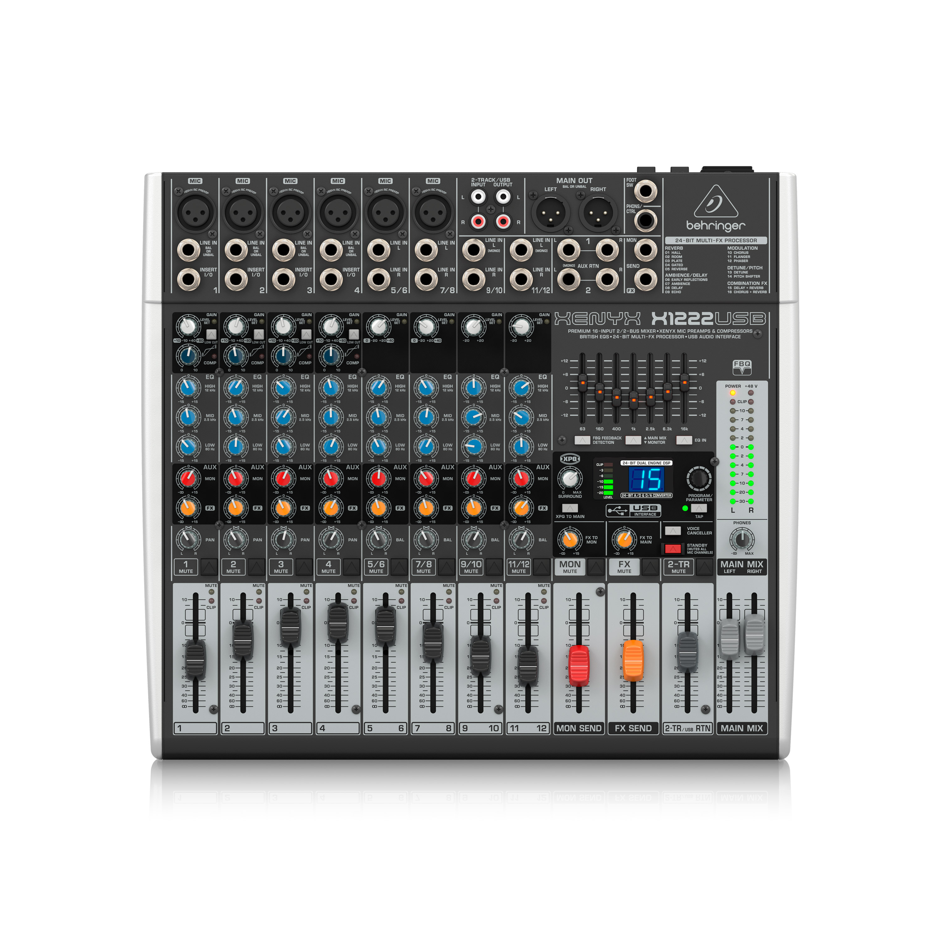Un égaliseur graphique à 7 bandes vous permet de vraiment composer le son que vous recherchez, et il peut être réglé sur le secteur ou sur les moniteurs. Le système de détection du Larsen FBQ vous aide à identifier les fréquences incriminées afin de les apprivoiser, et l'effet Surround 3D stéréo XPQ donne à vos mixages un son énorme, remplissant la pièce. Mieux encore, vous pouvez facilement enregistrer la sortie stéréo du X1222USB sur votre ordinateur via USB, il est même livré avec une suite de logiciels gratuits d'enregistrement et de podcasting. Plus de détails