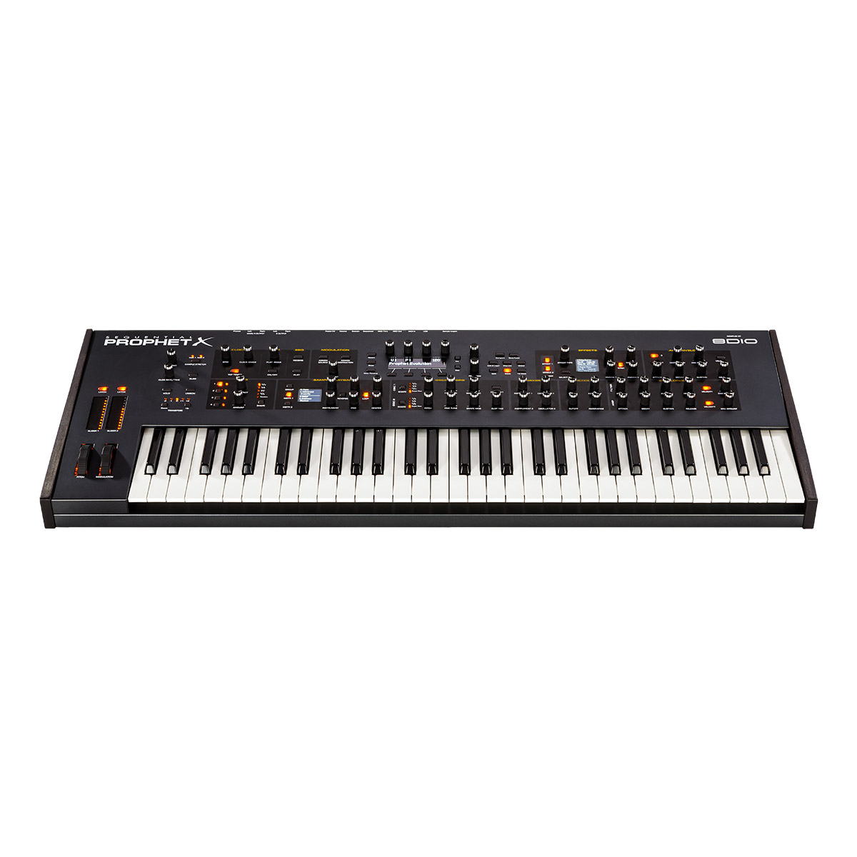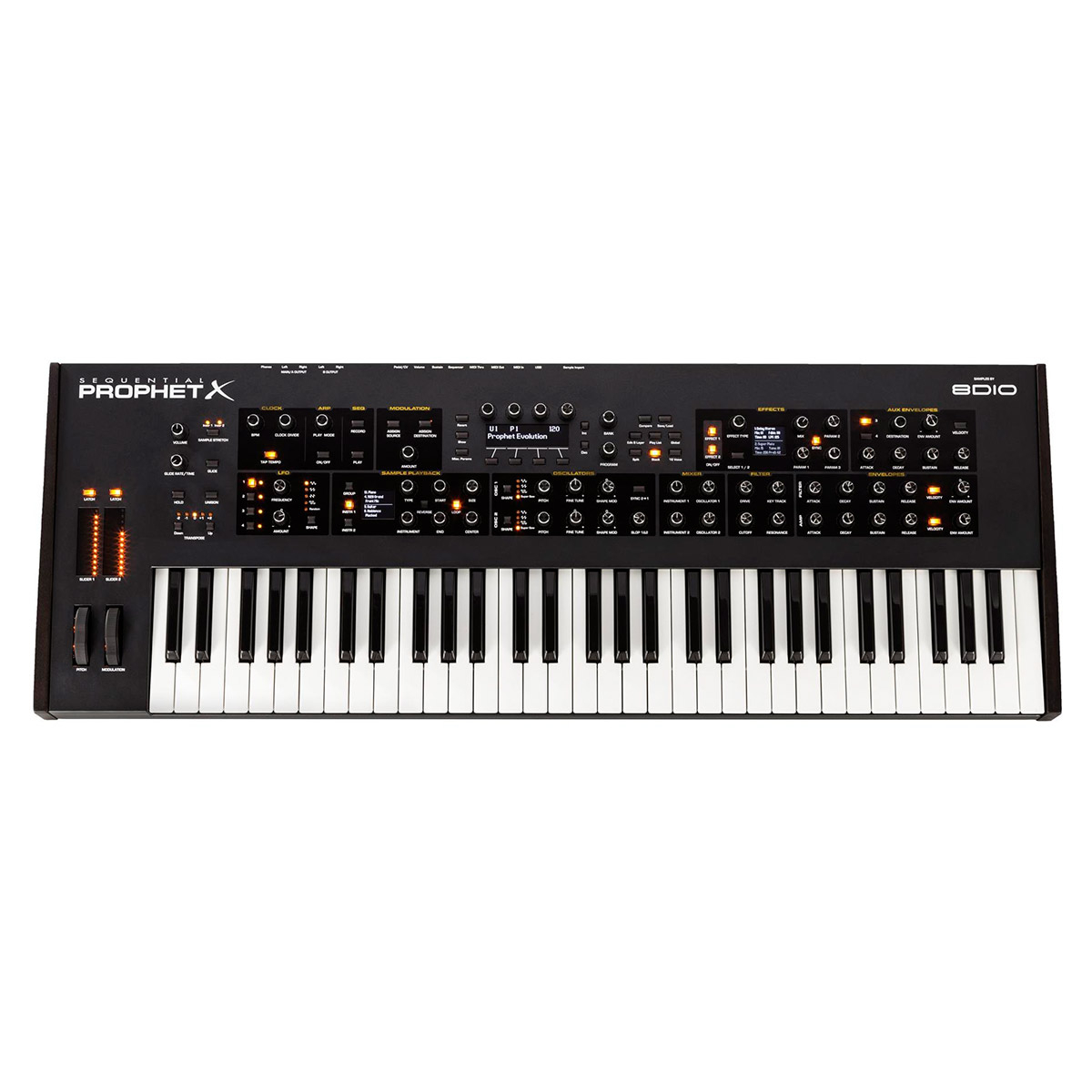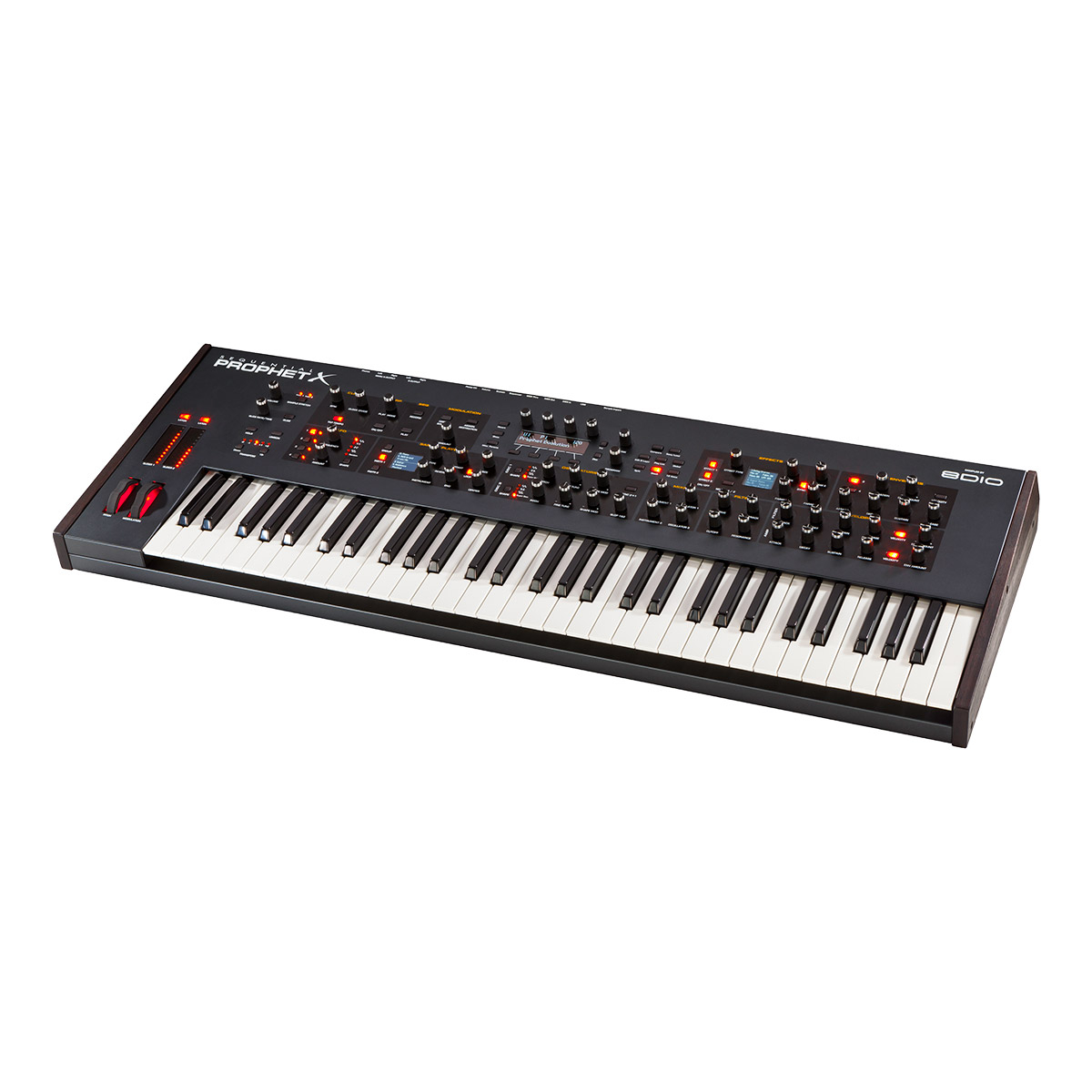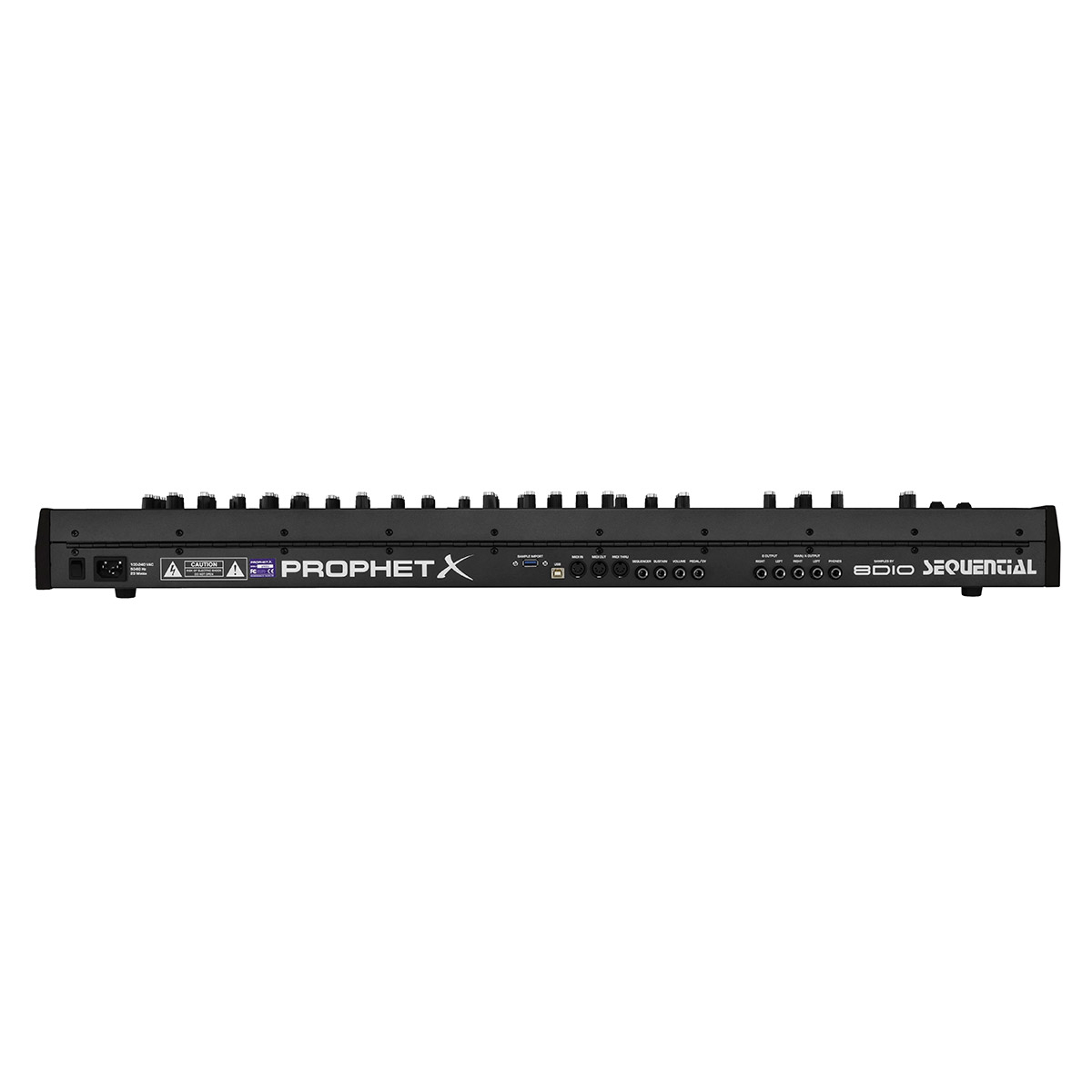 Le Sequential Prophet X est un Synthétiseur hybride 61 touches, 16 voix de polyphonie (8 voix stéréo ou 16 voix mono) avec 2 instruments échantillonnés en 16 bits/48 kHz, bibliothèque d'échantillons de 150 Go, 2 oscillateurs numériques, filtres analogiques stéréo, 4 générateurs d'enveloppes, 4 LFO, clavier semi-lesté sensible à la vélocité avec fonction Aftertouch, et effets intégrés.