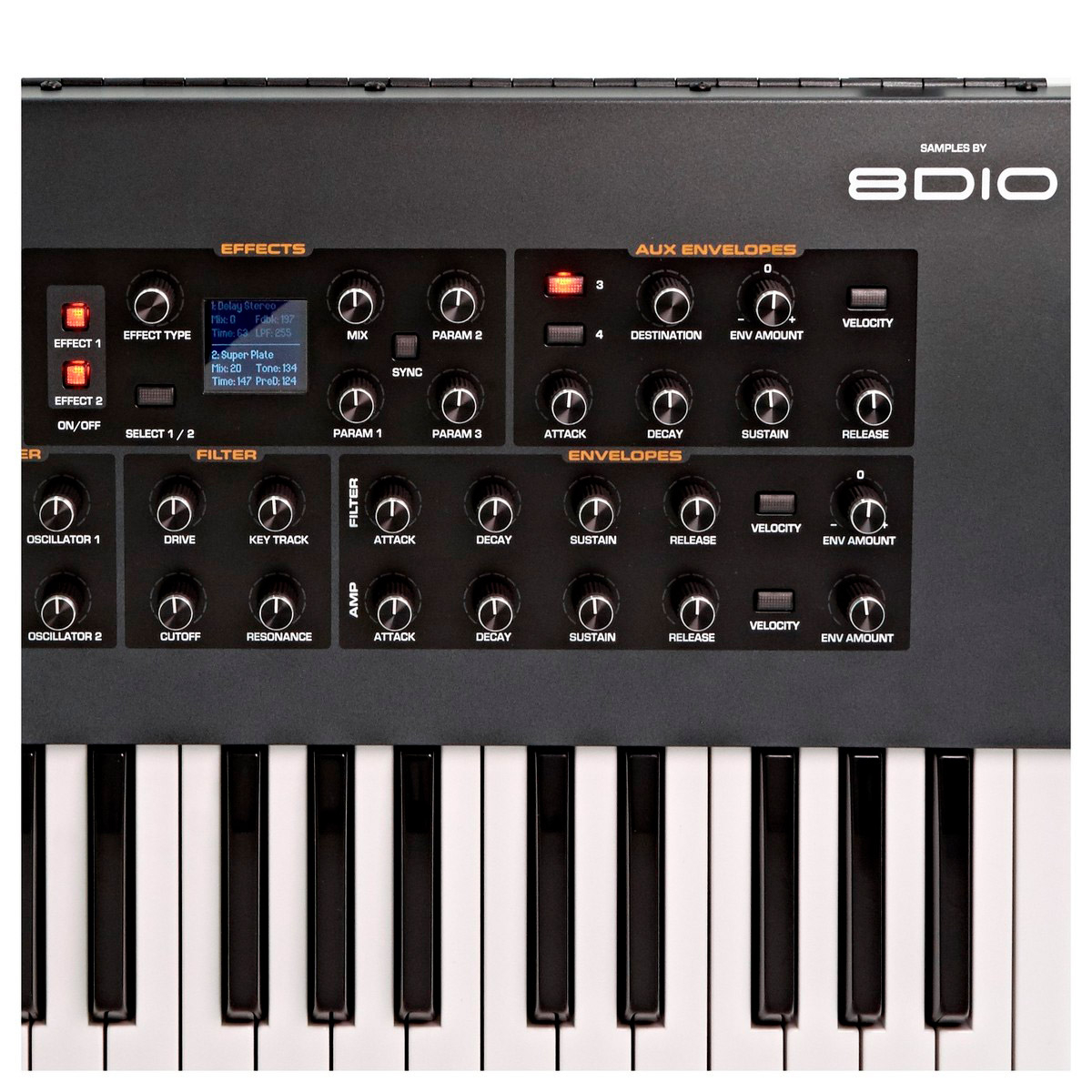 - Générateur de sons: 2 voix échantillonnées 16 bits/48 kHz + 2 oscillateurs numériques par voix avec des ondes sinusoïdales, en dents de scie, à impulsion et supersaw. Vous pouvez ainsi varier la forme de n'importe quelle forme d'onde.
