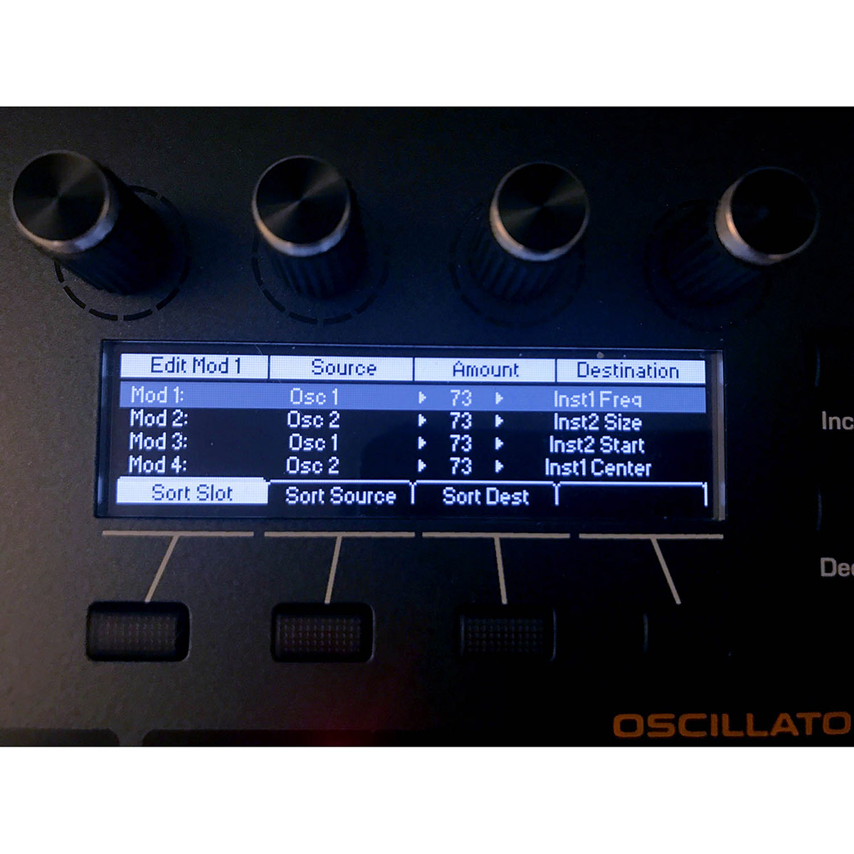 - 11 sources supplémentaires dédiées : molette de modulation, pression, vélocité, interrupteur au pied, LFO 1, LFO 2, LFO 3, LFO 4, Env 3, Env 4, Env 4