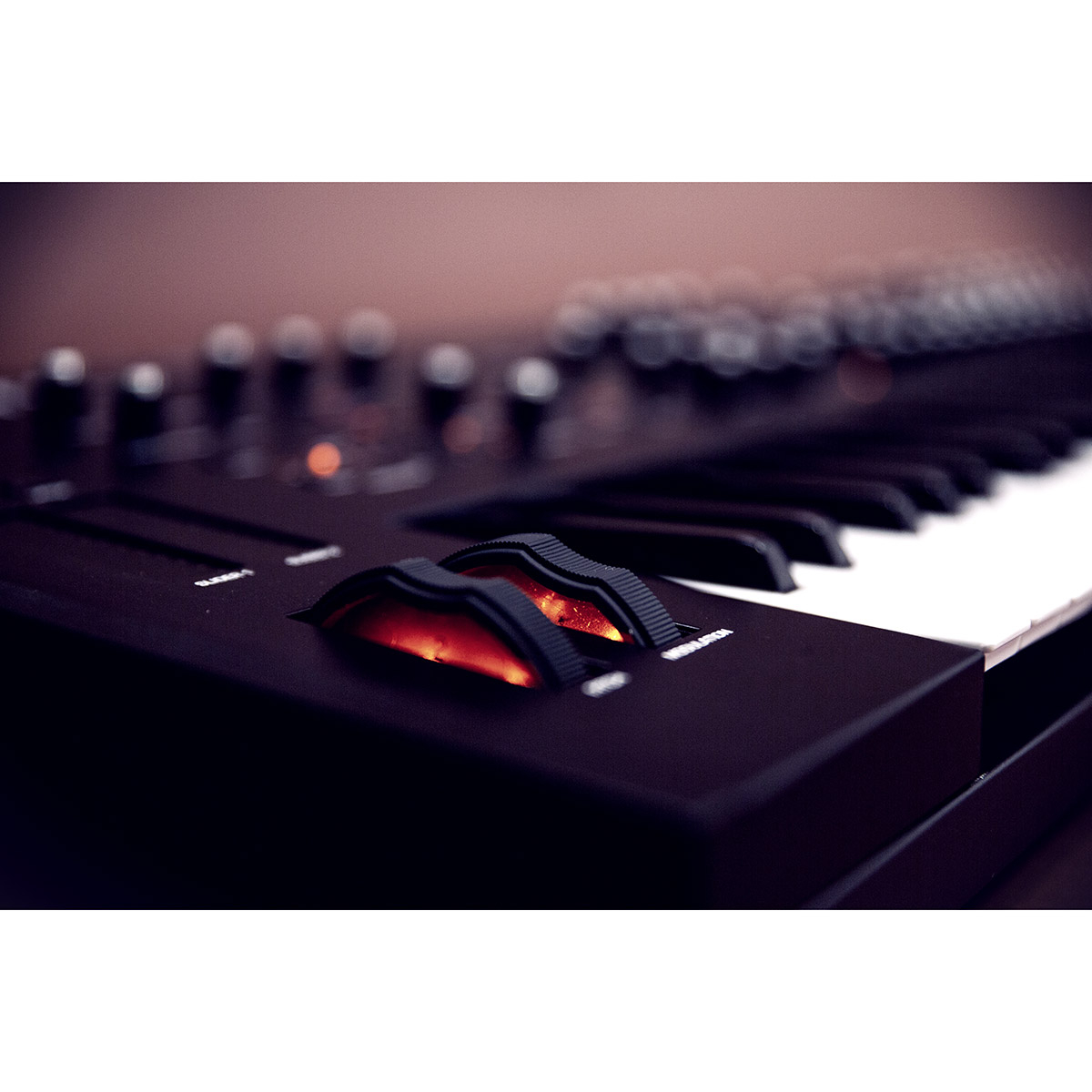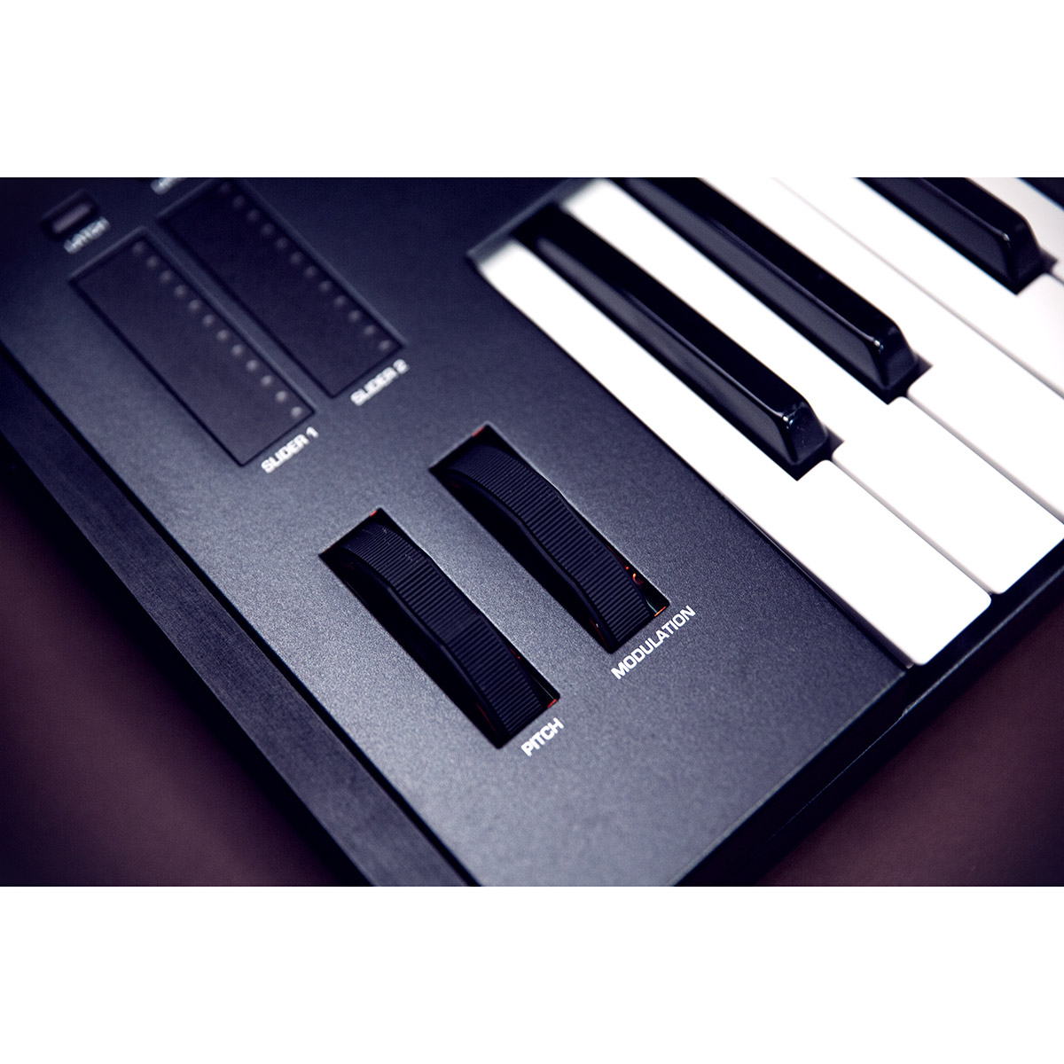 - Molettes de Pitch et de modulation. Le pitch a une étendue sélectionnable par programme (1 à 12 demi-tons vers le haut et vers le bas) et il est possible de transposer les commandes d'une gamme de 8 octaves