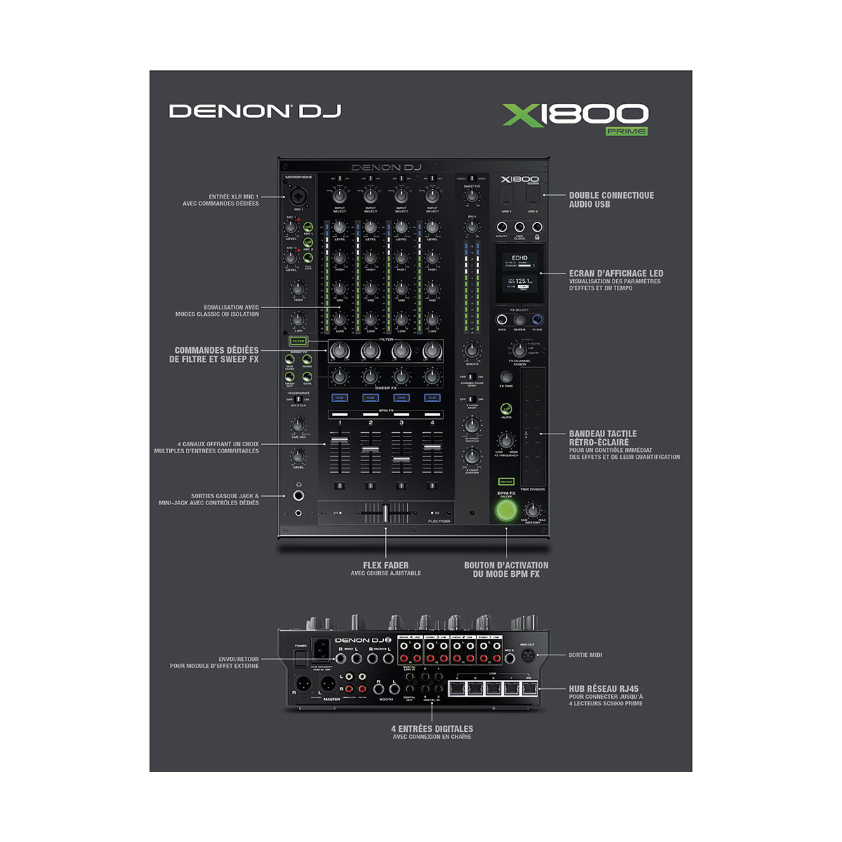 - Le mixeur est la pièce maîtresse de n’importe quelle configuration de DJ, la X1800 Prime ajoute la célèbre qualité sonore Denon dans une configuration familière aux clubs avec de nouveaux effets, plus de contrôles dédiés et une connexion avec les lecteurs SC5000 Prime qui privilégient le plaisir et le tout intégré, pour une expérience DJ exceptionnelle.