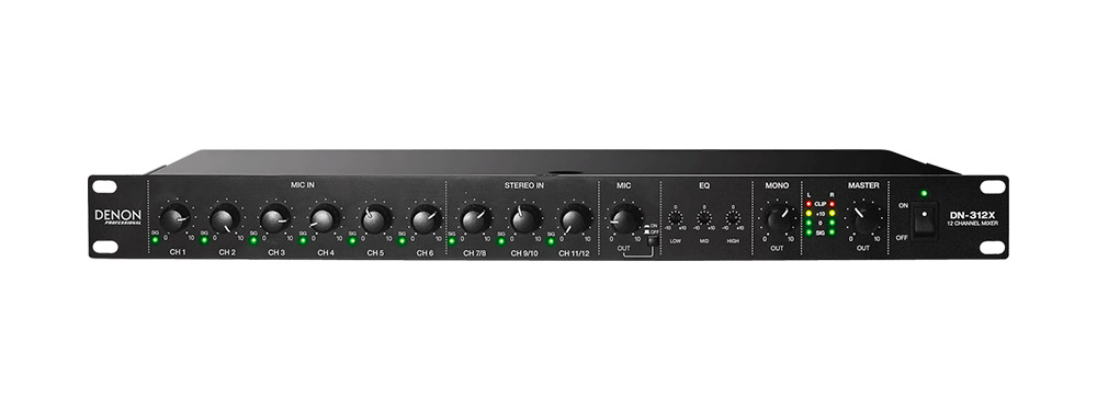 Le Denon DN-312X est un mixeur analogique 12 canaux Micro/Ligne, au format rackable 19" 1U. Il est équipé de 6 préamplis micro HDHQ Denon-Marantz, 12 entrées niveau ligne, sorties symétriques, priorité micro 1 réglable, égaliseur 3 bandes et alimentation en courant alternatif ou continu. Plus de détails