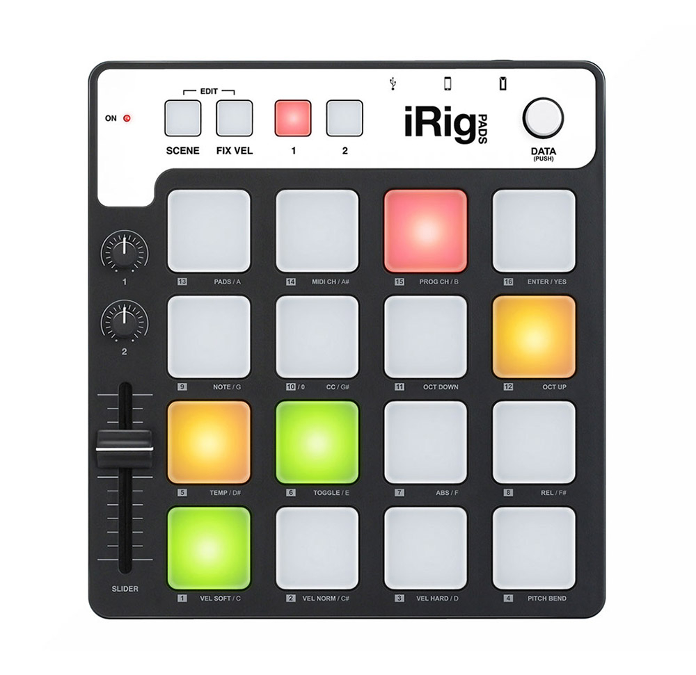 Le iRig Pads est équipé de deux boutons, deux boutons poussoirs, un fader et un potentiomètre rotatif, tous assignables MIDI. Bien sûr, vous disposez également de 16 pads rétro-éclairés multicolores, sensibles à la vélocité. L' iRig Pads a jusqu'à 16 scans MIDI distincts. Ils peuvent être sauvegardés et rappelés en naviguant instantanément dans vos applications, et logiciels sans effort.