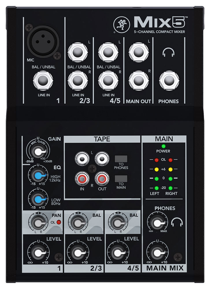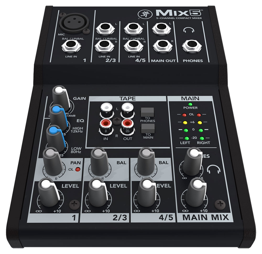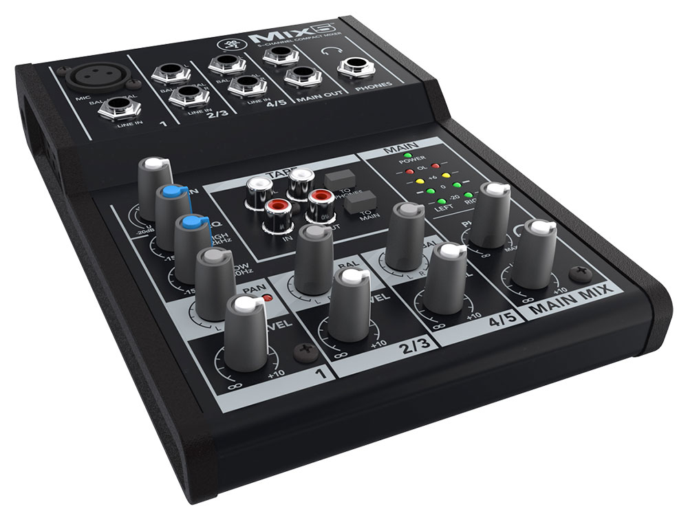La Mackie Mix5 est une console de mixage analogique 5 entrées avec 1 préampli microphone, 2 canaux stéréo, E/S Tape, et niveaux de volume et de casque séparés. Plus de détails