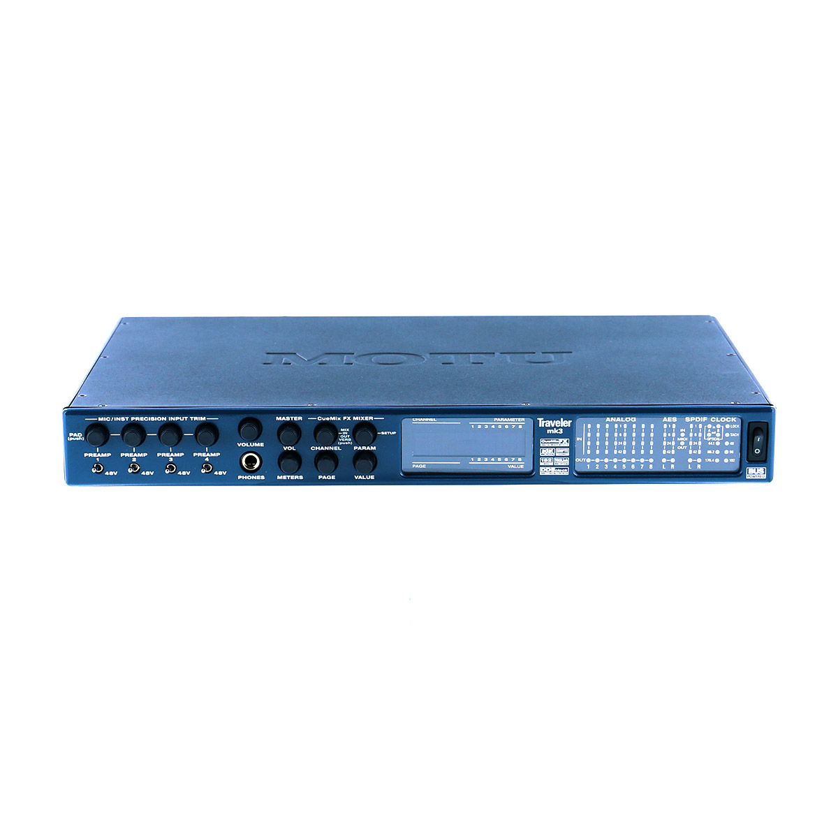 La Motu Traveler-mk3 convient aussi bien aux applications de studio que sur scène ou en enregistrement mobile, avec ou sans ordinateur. Utilisée en tant qu’interface audio ou en tant que mixeur autonome, la Traveler-mk3 gère 28 entrées et 30 sorties séparées – dont 4 entrées analogiques micro/instrument sur connecteur Combo (mixte XLR/jack 6,35 mm), équipées de préamplis, d’une alimentation fantôme 48 Volts activable séparément, et de potentiomètres Digital Precision Trim™, réglables depuis la face avant ou accessibles via le logiciel CueMix FX™.