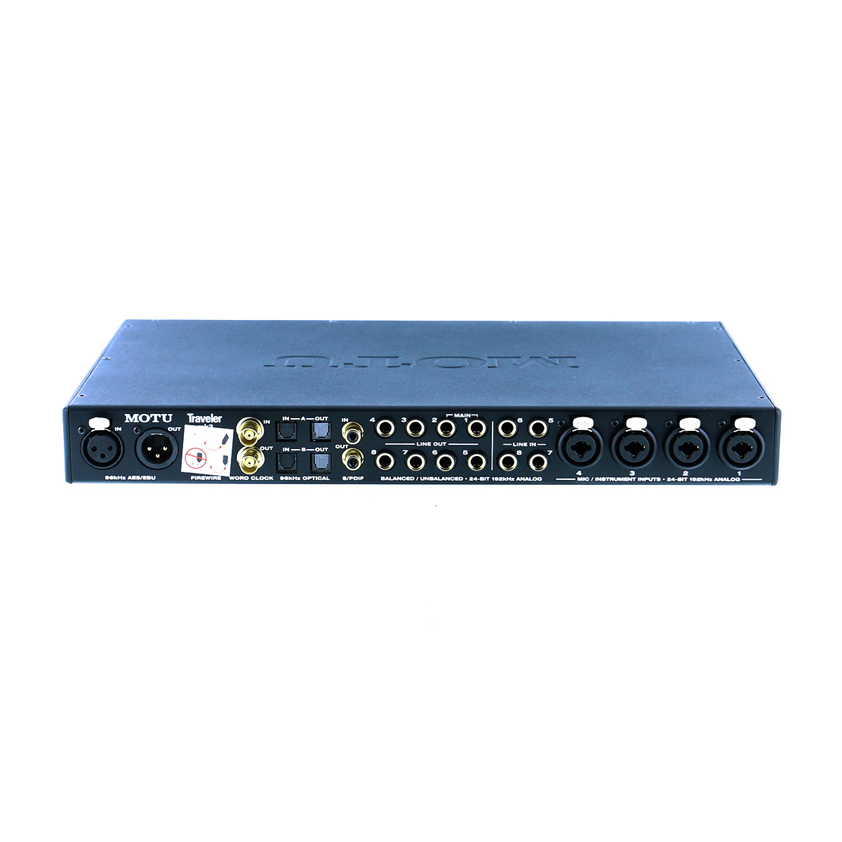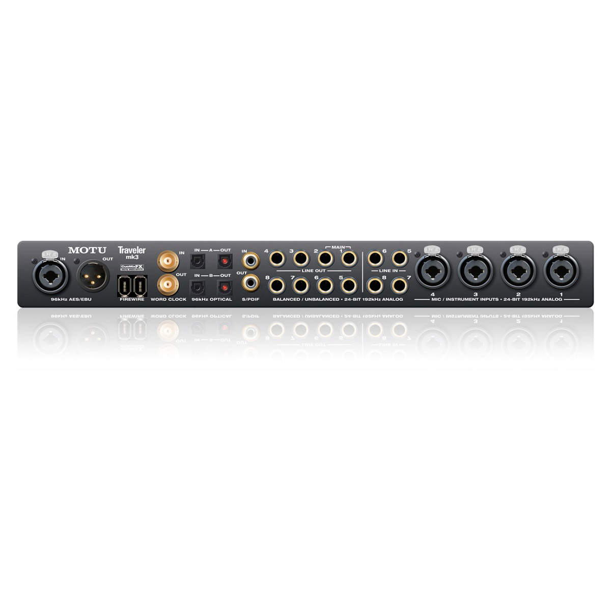 - 28 entrées / 30 sorties (à 44,1/48 kHz) – aucun partage d’entrées dans la Traveler-mk3. Les entrées micro, les jacks TRS, les connecteurs numériques AES/EBU, S/PDIF et la sortie casque sont tous gérés séparément.