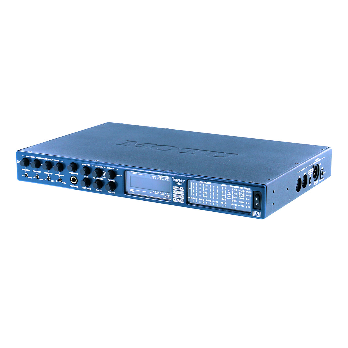 Conçue pour les applications d’enregistrement mobile haut de gamme, la Motu Traveler-mk3 possède 4 entrées micro de très haute qualité. Elle s’alimente par le bus FireWire ou par piles (en option), et intègre des fonctions de mixage et des effets DSP.La Motu Traveler-mk3 offre 8 canaux d’enregistrement/lecture analogique jusqu’en 192 kHz – un niveau de qualité extrême – et 20 canaux d’entrée/sortie numérique, aux formats ADAT, AES/EBU et S/PDIF. Pour étendre encore ces possibilités, il suffit de lui relier d’autres interfaces audio FireWire MOTU, ou la 8pre, comme expandeur d’entrées micro.