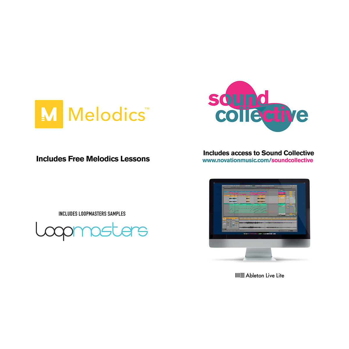 Livré avec Ableton Live Lite, le synthé Bass Station de Novation et le pack de samples Loopmasters.