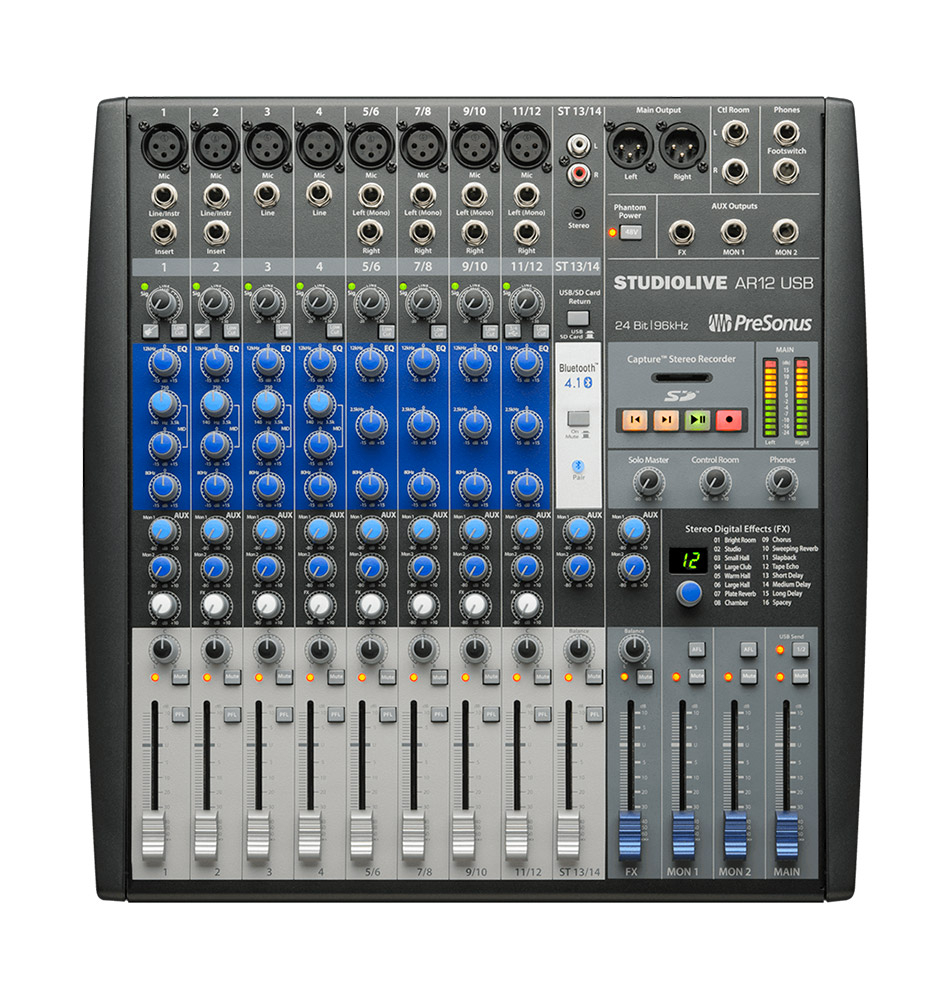Le StudioLive AR12 USB est doté d'un circuit audio de qualité : préamplis de classe A à faible bruit, égaliseurs 3 canaux analogiques à 3 bandes, et filtres passe-bas musicaux. Puissant et facile à appairer en Bluetooth 4.1, le StudioLive AR12 USB se connecte à n'importe quel appareil mobile compatible en quelques secondes, pour s'assurer que votre console ne sera jamais sans musique. Les iPods plus anciens et les appareils de musique avec écouteurs standard peuvent également être utilisés, grâce à une prise auxiliaire stéréo de 3,5 mm.