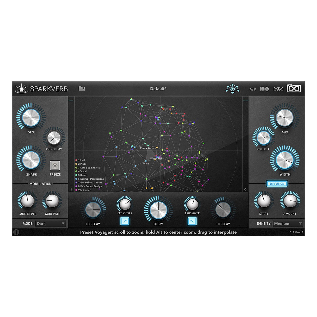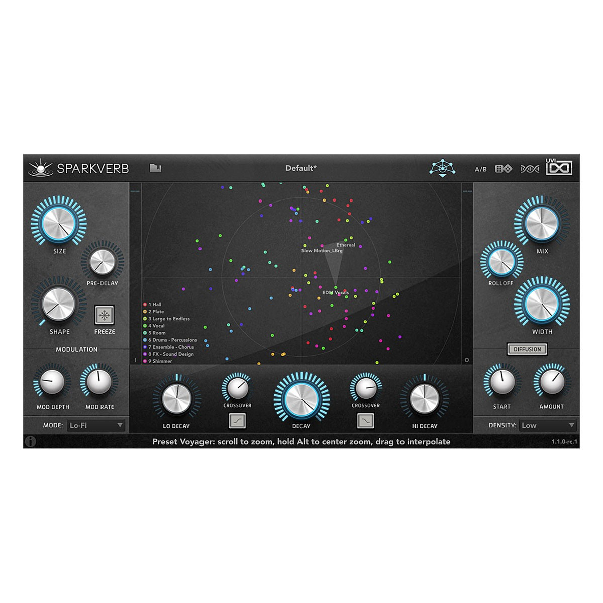 Lors de son lancement, Sparkverb analyse tous les préréglages et créé un espace à deux dimensions qui les organise par similarité. Il vous suffit alors d’afficher le « Preset Voyager » et faire glisser la souris entre les différents points afin d’interpoler librement entre les réglages. Vous pouvez observer les changements de paramètres qui en découlent en temps réel afin d’en constater les effets et créer ainsi de nouveaux réglages inédits. Les possibilités sont infinies.